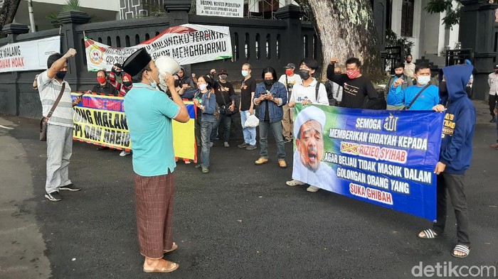 Teriakan penolakan Habib Rizieq ke Kota Malang disampaikan massa aksi berulang-ulang. Bukan hanya itu, massa juga meminta pembubaran Front Pembela Islam atau FPI.