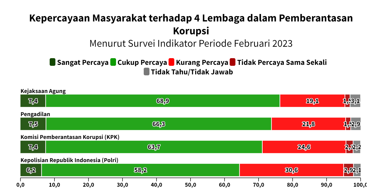 Di posisi kedua ada Pengadilan yang dipercayai oleh sekitar 75,1% responden dan kurang atau tidak dipercaya oleh sekitar 21,2% responden. KPK berada di posisi tiga dengan tingkat kepercayaan sekitar 72,9% dan di Polri menjadi institusi dengan tingkat kepercayaan terendah dengan persentase sekitar 68,3%.