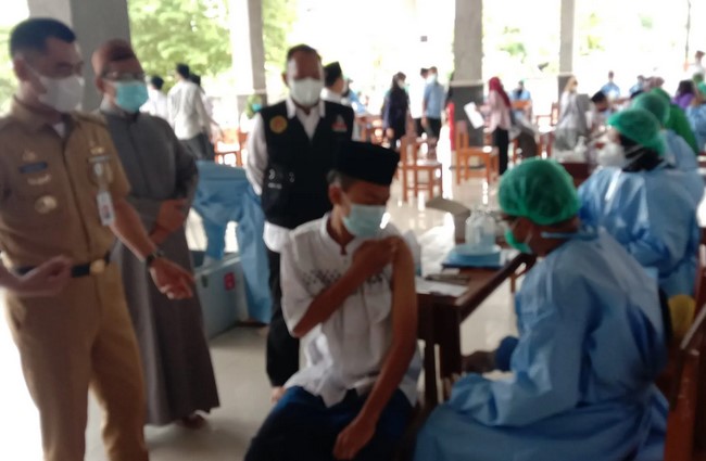 Sejumlah ratusan santri di Pondok Pesantren Darul Qur’an Al Irsyad yang berada di Padukuhan Ledoksari, Kalurahan Kepek, Kapanewon Wonosari menjalani vaksinasi masal, Selasa (03/08/2021). Vaksinasi tersebut merupakan kerjasama dengan Badan Intelejen Negara (BIN) wilayah DIY, Kantor Kementrian Agama (Kemenag), Dinas Kesehatan dan SMK Kesehatan Wonosari.