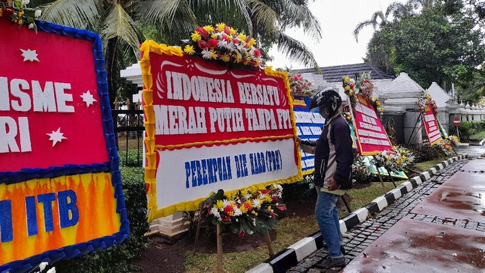 Ada pula karangan bunga dari Trisaksi Untuk Indonesia (TUI) yang menuliskan ‘PEMBUBARAN FPI KADO TERINDAH AKHIR 2020 UNTUK NKRI’.