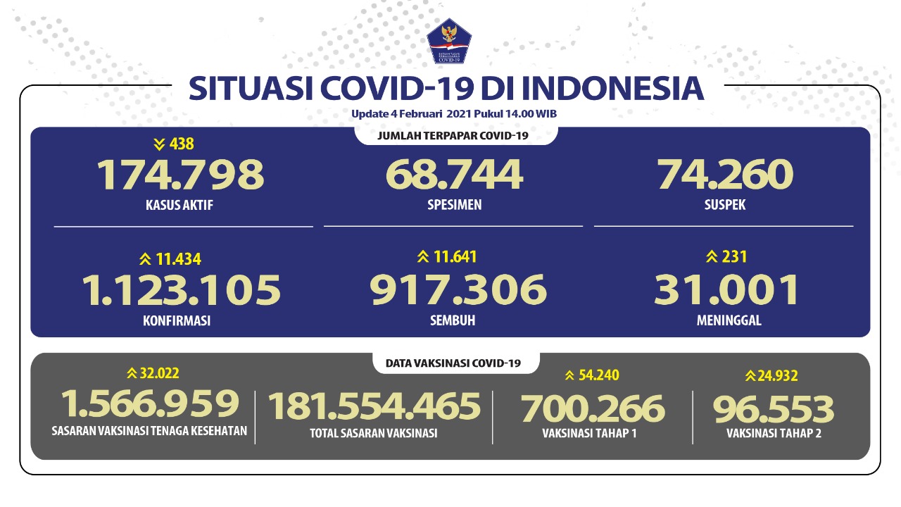 Perkembangan penanganan Covid-19 per 4 Februari 2021, penerima vaksin di Indonesia bertambah sebanyak 54.240 orang dan total penerima meningkat menjadi 700.266 orang. Untuk total sasaran vaksinasi Covid-19, sebanyak 181.554.465 orang. Dan dari jumlah tersebut, terdapat sasaran vaksinasi SDMK (Sumberdaya Manusia Kesehatan), yang per hari ini jumlah sasaran meningkat 32.022 orang menjadi totalnya sebanyak 1.566.959 orang.