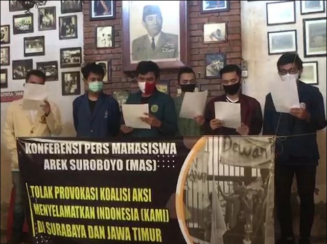 Sejumlah mahasiswa yang tergabung dalam elemen Mahasiswa Arek Suroboyo (MAS) mengecam pernyataan deklarator Koalisi Aksi Menyelamatkan Indonesia (KAMI) Gatot Nurmantyo di channel Youtube Hersubeno Point, beberapa waktu lalu.