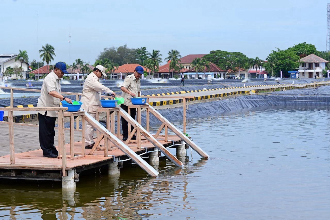 Presiden Prabowo bersama Menteri Kelautan dan Perikanan Sakti Wahyu Trenggono serta Wakil Menteri Kelautan dan Perikanan Didit Herdiawan kemudian melakukan penebaran benih ikan nila salin di salah satu kolam tambak. Penebaran ini diharapkan dapat meningkatkan produktivitas tambak serta mendukung program prioritas Kementerian Kelautan dan Perikanan (KKP) berbasis ekonomi biru.