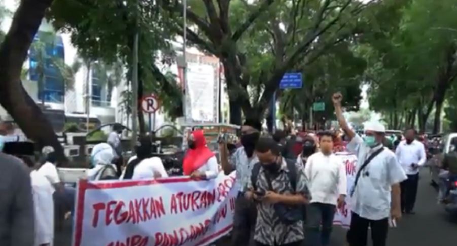 Ratusan massa mengatasnamakan umat Islam Kota Medan menggelar aksi unjuk rasa menolak kedatangan Habib Rizieq Shihab di Kota Medan.