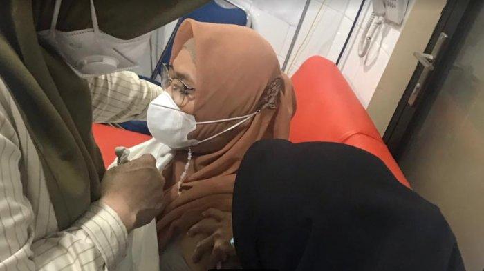 Rektor Universitas Islam Makassar (UIM) A Majdah M Zain menerima vaksin kakebalan Covid-19 di Rumah Sakit Pertiwi, Makassar, Senin (22/2/2021).